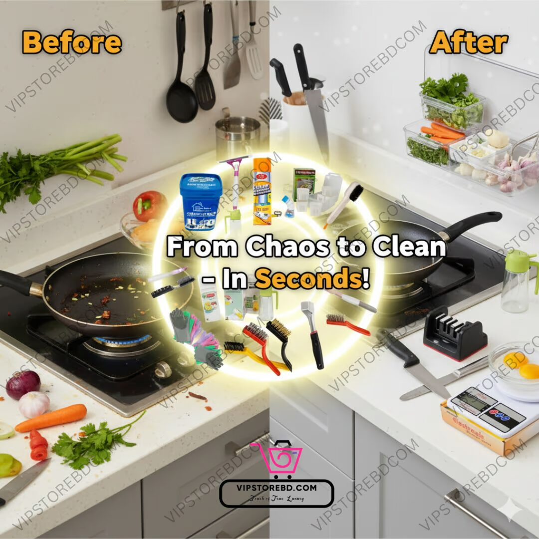 Before and after kitchen transformation with VIPSTOREBD 11-in-1 kitchen helper combo pack.Kitchen Helper Combo Package – 11 in 1 Essentials Pack for Smart Kitchen Transformation | VIPSTOREBD Exclusive